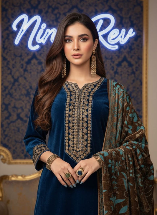 Royal Blue Embroidered Velvet 3 Pcs Dress with Palachi Shawl