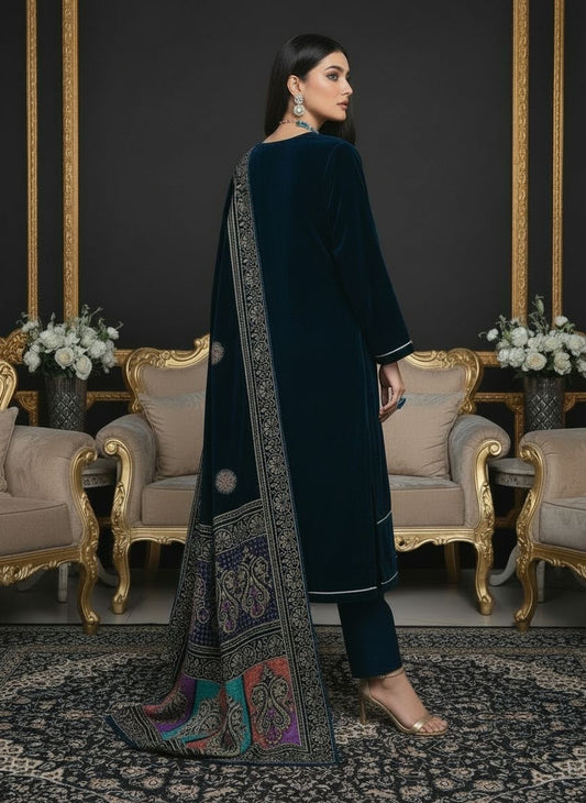 Areeba Teal Velvet Ready to Wear 3 Pcs Dress with Shawl