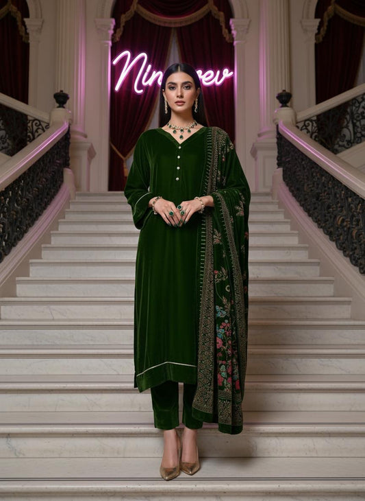 Shahkar Green Velvet Ready to Wear 3 Pcs Collection with Velvet Shawl