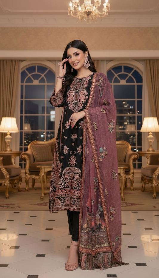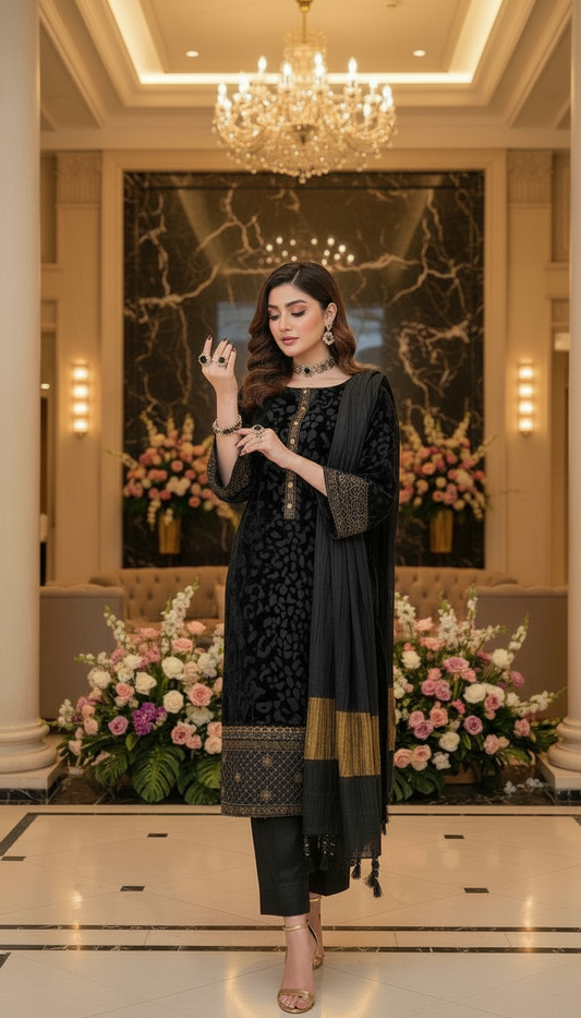 Lilly Black French Velvet 3 Pcs Dress with Velvet Shawl