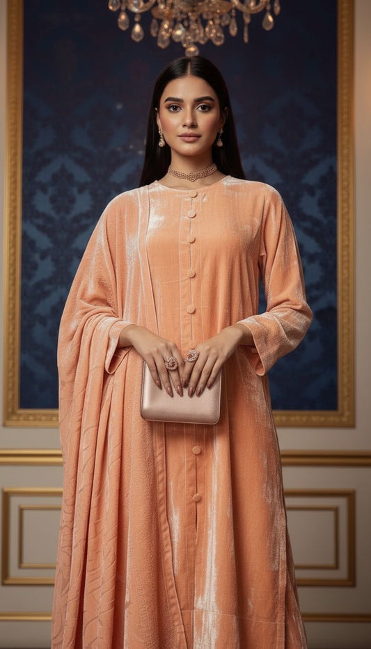 Rehar Peach French Velvet Ready to Wear 3 Pcs Dress