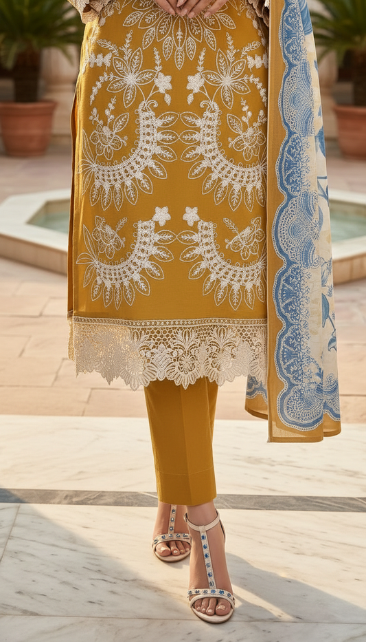Sharvi Mustard Chikankari Embroidered 3 Pcs Dress