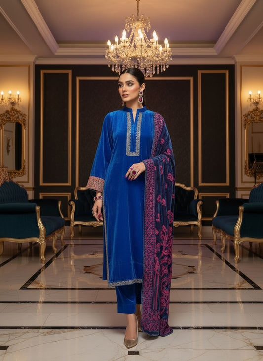 Royal Blue Embroidered Velvet 3 Pcs Dress with Palachi Shawl