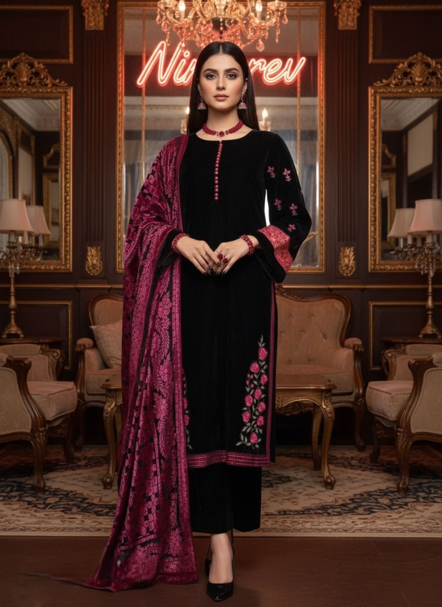 Chandan Ready to Wear 3 Pcs Velvet Embroidered dress with Palachi Shawl