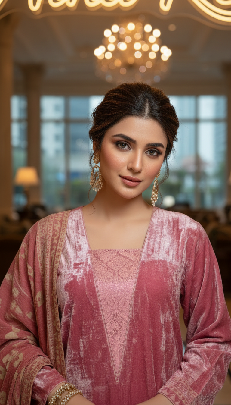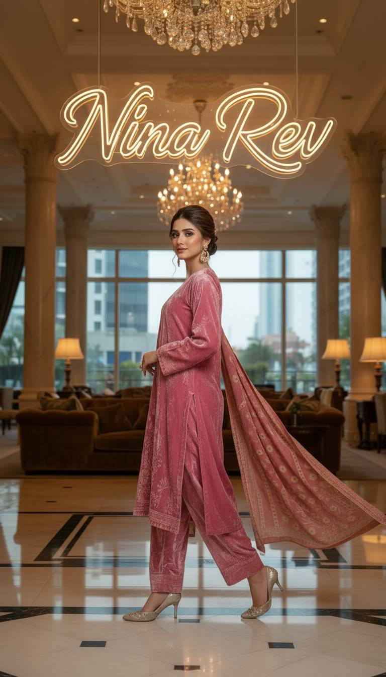 Fancy Pink French Velvet 3 Pcs Dress with Velvet Shawl