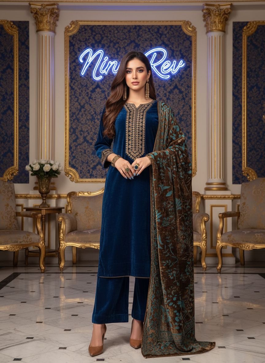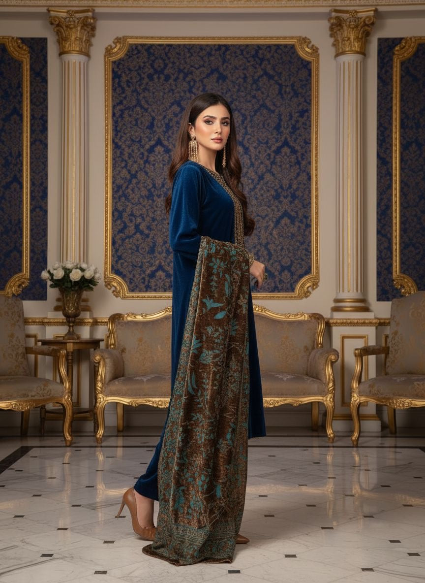 Freya Velvet Embroidered Ready to Wear 3 Pcs Dress with Palachi Shawl