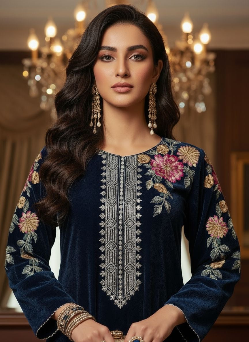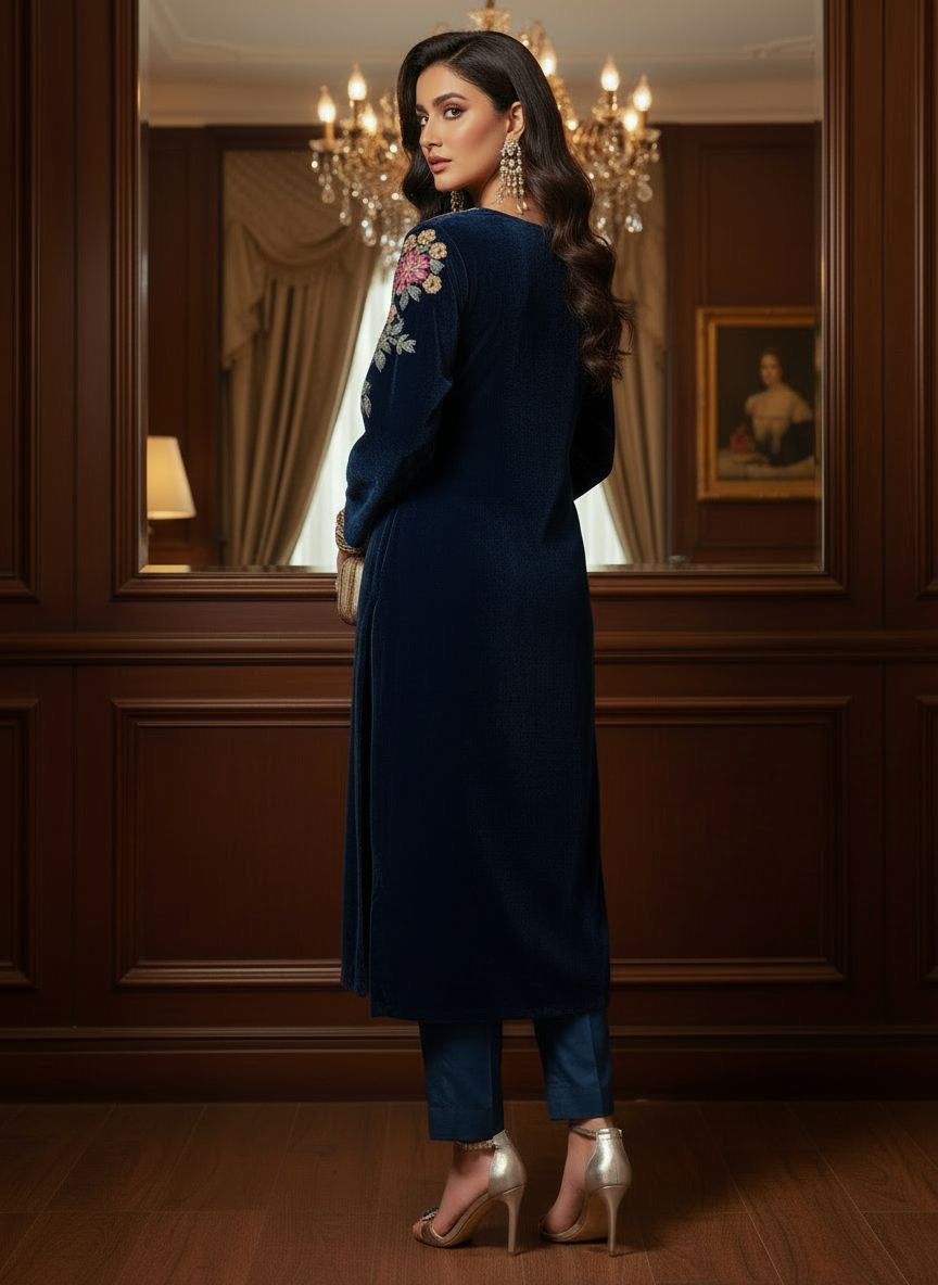 Haniya Teal Velvet Embroidered 2 Pcs Dress