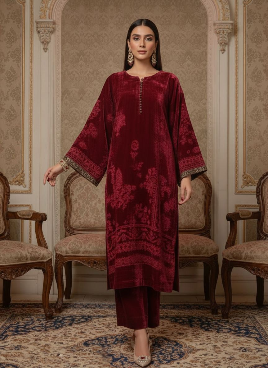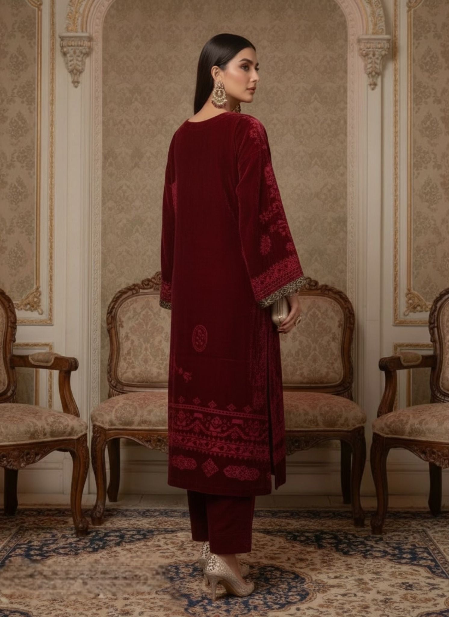 Kamera Maroon French Velvet Ready to Wear 2 Pcs Dress with Palachi Work