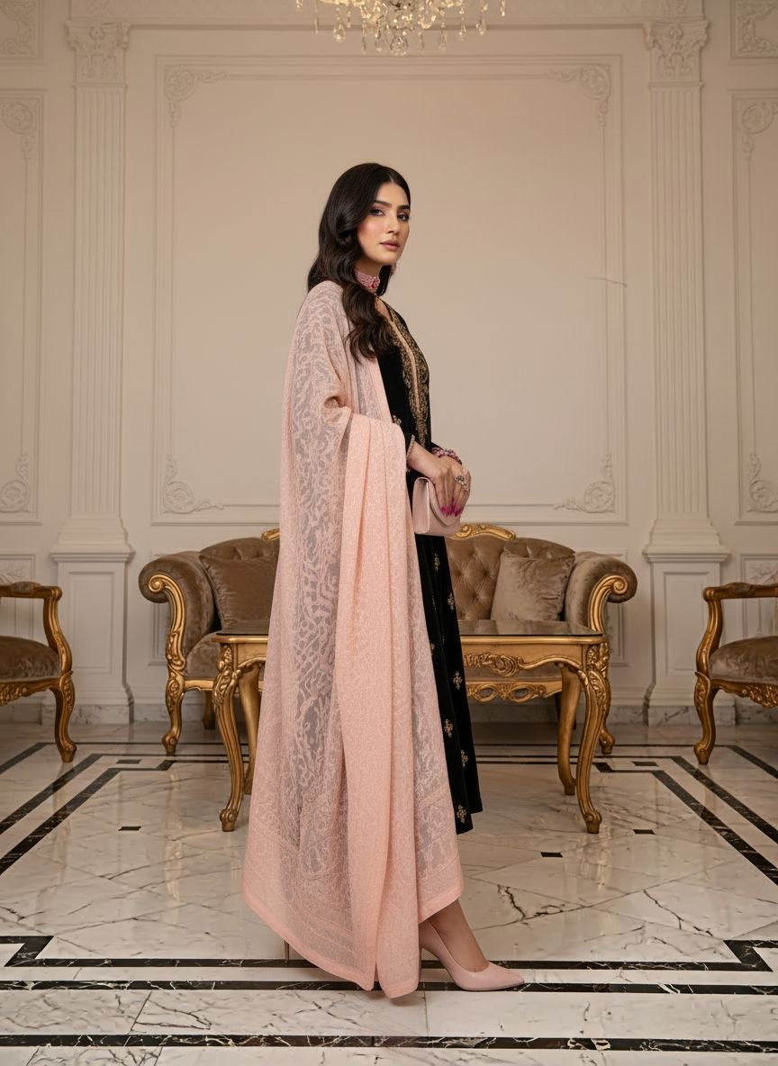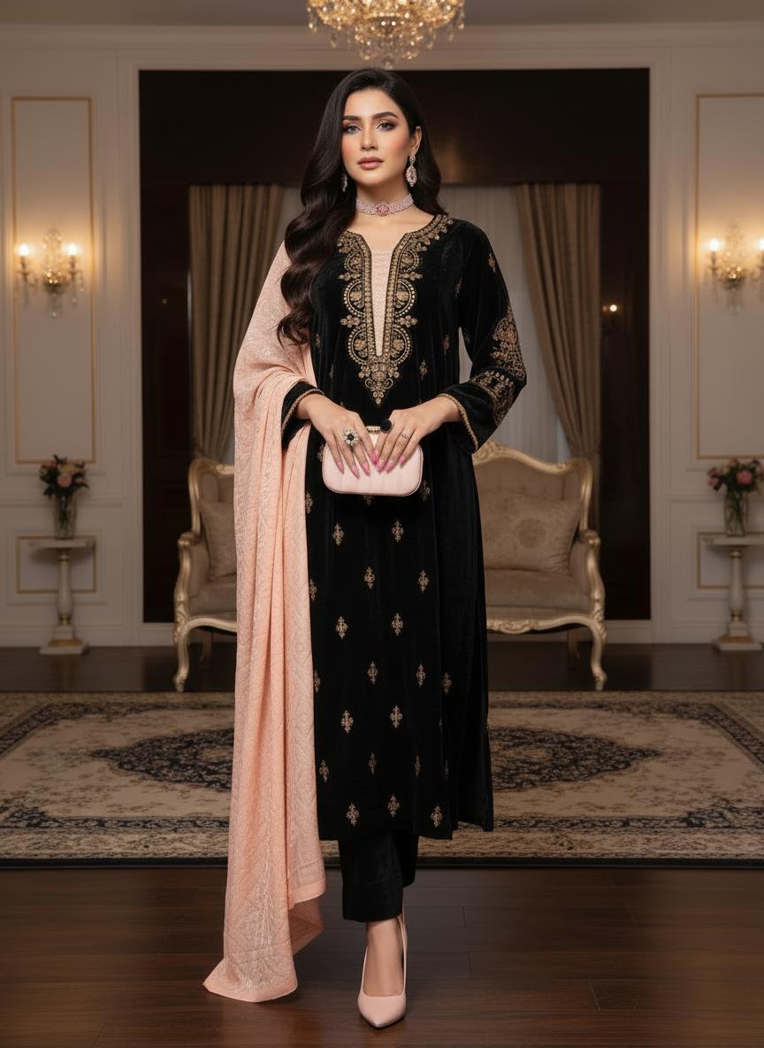 Qalamkar 3 Pcs Ready to Wear Velvet Dress with Palachi Shawl